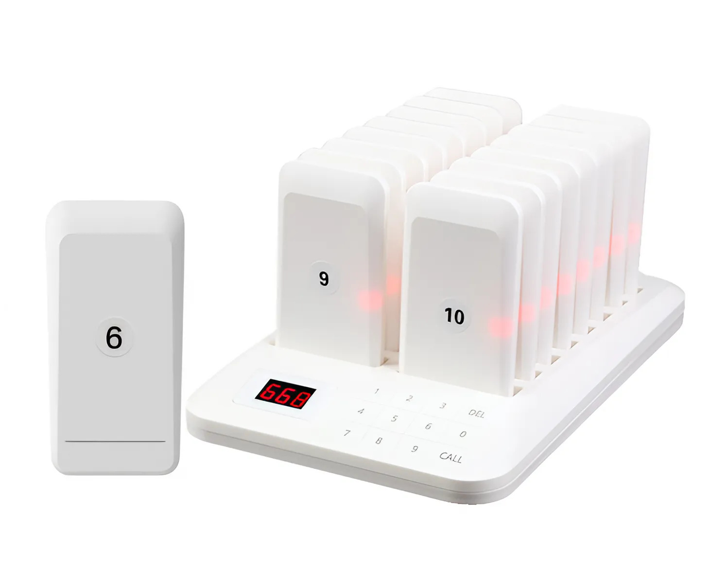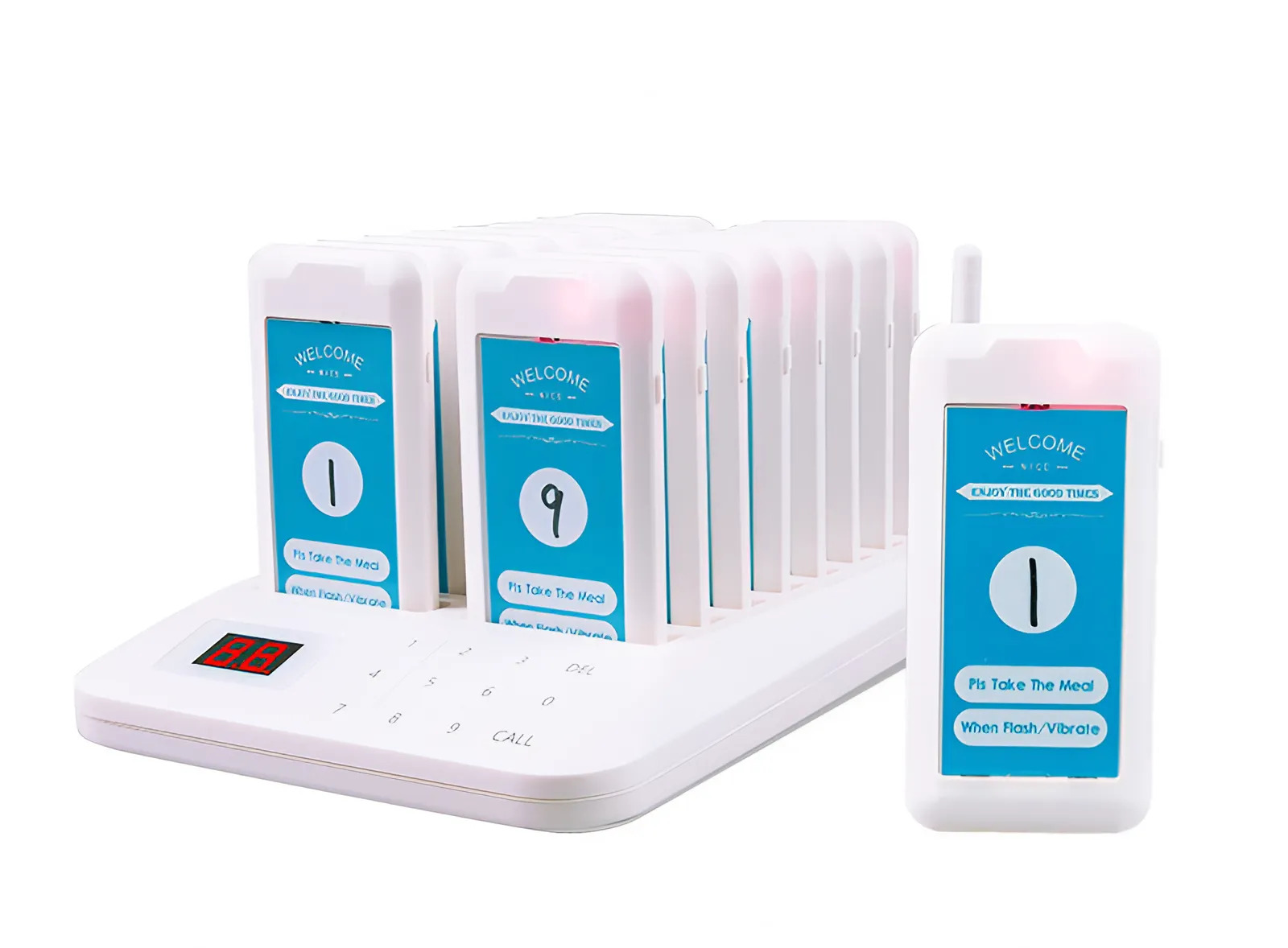16 téléavertisseurs sans fil BLANCS pour la commande de nourriture pour les hôtels et les restaurants. Ce système abordable fournit un affichage numérique LED à 3 chiffres clair et durable. Il offre 7 modes d'alerte, dont le son, les vibrations et les lumières clignotantes, avec la possibilité de les combiner. La durée du rappel peut être réglée de 1 à 999 secondes. Il s'allume automatiquement pendant le chargement et le couplage de code sans fil lui permet de se connecter à 998 téléavertisseurs.